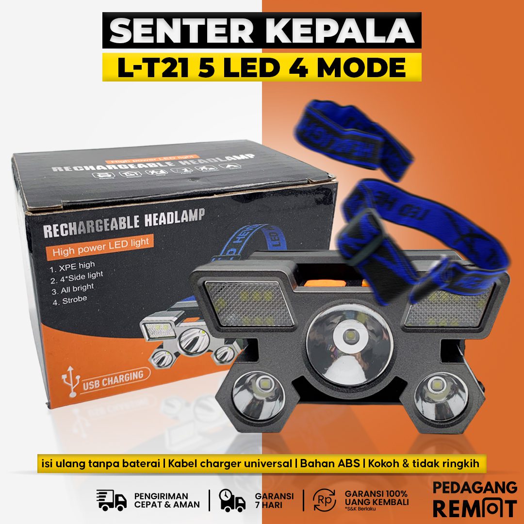 Nama Produk : HeadLamp Light Lampu Senter Kepala 5 LED 4 Mode USB Charge L-T21
