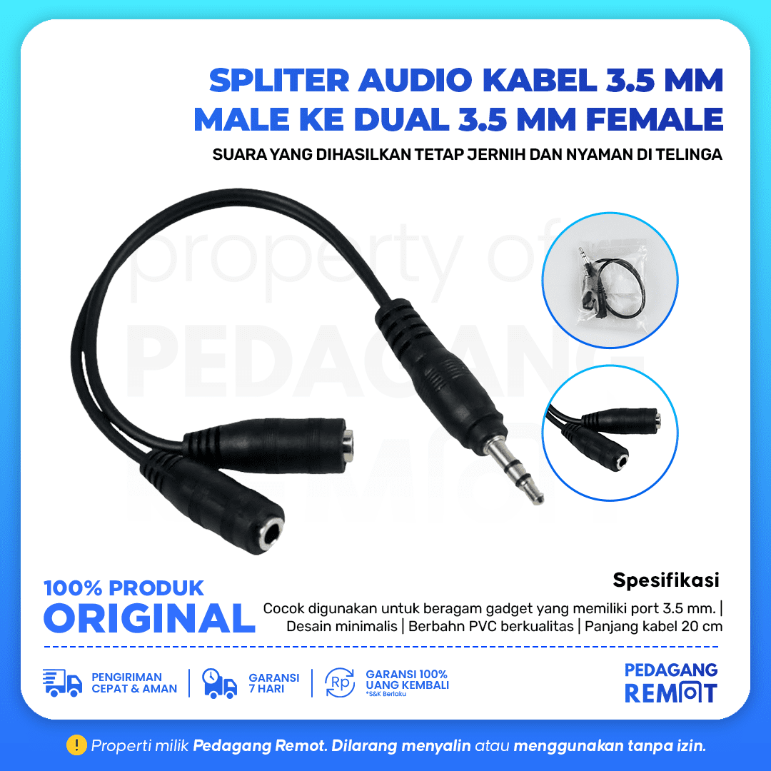 Kabel splitter ini dapat digunakan oleh seluruh perangkat pemutar lagu yang memiliki port 3.5 mm seperti smartphone, tablet, MP3 player, dan media pemutar lagu lainnya.