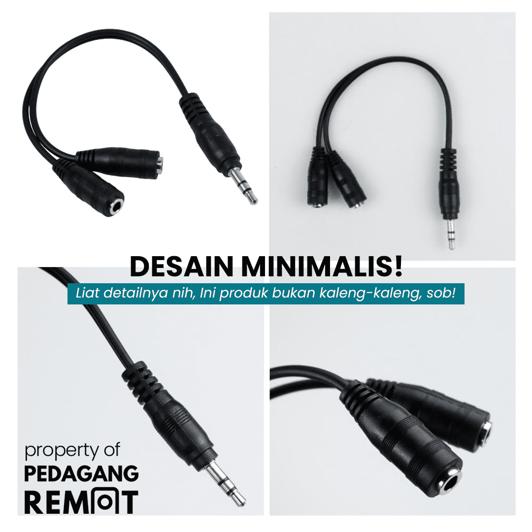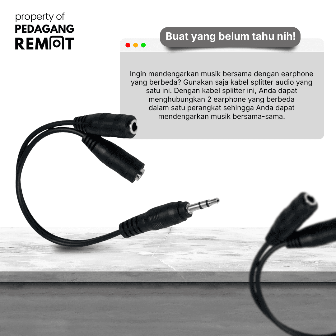 Dengan kabel ini, Anda dapat menggunakan 2 buah headphone sekaligus sehingga Anda dapat membagikan lagu favorit bersama teman. Sebagai catatan, Anda hanya dapat menggunakan spliter ini untuk audio output.